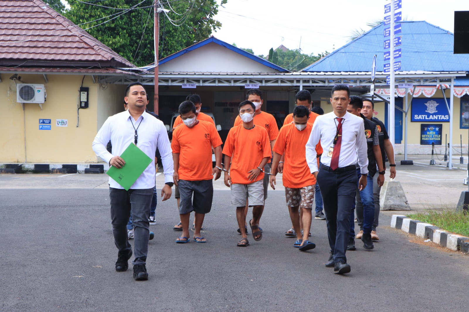 Keenam orang pelaku sudah diamankan di Mapolres Banyuasin guna pemeriksaan lebih lanjut. Kepada 6 orang tersangka tersebut dikenakan pasal 92 Jo Pasal 26 ayat (1)atau pasal 88 Jo pasal 16 ayat (1) UU RI nomor 31 tahun 2004 tentang perikanan sebagaimana telah di rubah dengan UU RI nomor 45 tahun 2009 tentang perubahan UU RI nomor 31 tahun 2004 tentang perikanan dengan ancaman penjara 6 tahun dan denda 1.500.000.000 ( satu milyar Lima ratus juta rupiah)