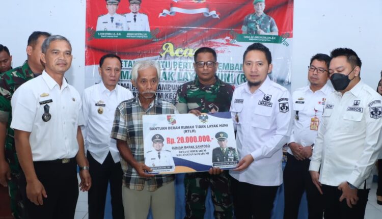 Wabub Lampura, Ardian Saputra bersama Dandim 0412/LU, Letkol Inf Andi Sultan, Camat Kotabumi Juni Ria di, Sekertaris Dinsos Gadri menyerahkan bantuan RTLH sebesar Rp. 20.000.000 (Dua puluh Juta) rupiah kepada warga desa Sumber Arum bernama Santoso.