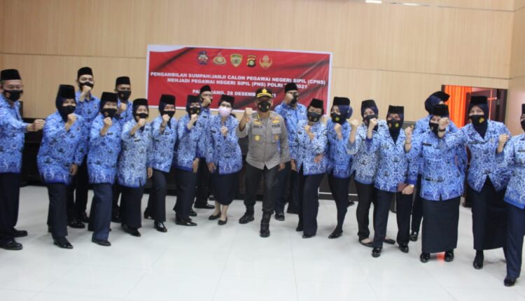 Palembang | Sriwijayaterkini.co.id – Kapolda Sumsel Irjen Pol Drs.Toni Harmanto,MH yang diwakili Karo Sdm Polda Sumsel Kombes Pol Ucu Kuspriyadi Sik,MH,Msi pimpin kegiatan pengambilan sumpah atau janji Calon Pegawai Negeri Sipil (CPNS) menjadi Pengawai Negeri Sipil (PNS) Polri tahun 2021 di ruang Catur Cakti lantai III Gedung Promoter Polda Sumsel pada Selasa (28/12).
