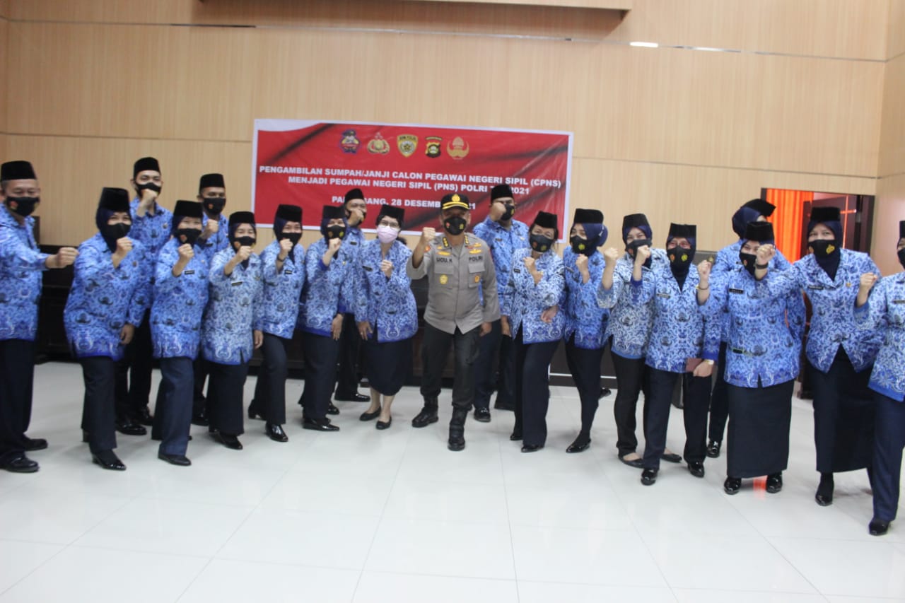 Karo Sdm Kombes Ucu membacakan arahan Kapolda Sumsel kepada PNS yang baru disumpah. “Saya ingin menyampaikan beberapa arahan untuk dipedomani dan dilaksanakan, sebagai berikut, teguhkan keimanan dan ketaqwaan terhadap tuhan yang maha kuasa, sebagai landasan komitmen moral dalam pelaksanaan tugas. Kemudian tingkatkan profesionalisme, Skill, kemampuan diri dan kuasai tugas,serta laksanakan tugas dengan penuh keikhlasan, serta dekatkan Polri kepada masyarakat. pahami bahwa keberadaan PNS merupakan wujud kehadiran negara di tengah rakyat. Selanjutnya pelihara soliditas, serta tingkatkan integritas diri dan kehormatan institusi Polri, dengan menghindari tindakan kontra produktif yang dapat menurunkan kepercayaan masyarakat terhadap Polri dan PNS pelihara komitmen untuk selalu menjadi tauladan bagi masyarakat, bawahan dan sesama rekan kerja. Terakhir kembangkan kompetensi diri melalui pelatihan atau pendidikan kejuruan guna mendukung pelaksanaan tugas,” ujarAlumni Sespimti 2020,