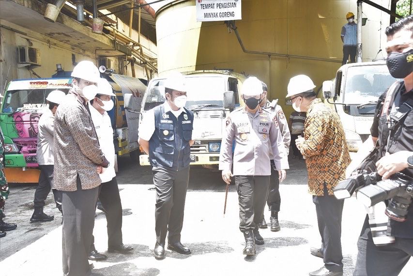 Setelah sekitar 15 menit mengecek proses produksi, rombongan Kapolri ini melanjutkan peninjauan ke tempat pengisian minyak goreng curah yang berada di samping luar pabrik.
