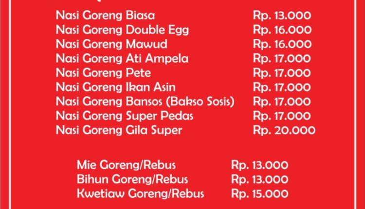 Varian harga disini terbilang cukup terjangkau baik bagi pelajar maupun masyarakat umum. harga mulai dari Rp. 13.000- Rp. 20.000 dengan porsi yang lebih banyak dibandingkan nasi goreng pada umumnya.