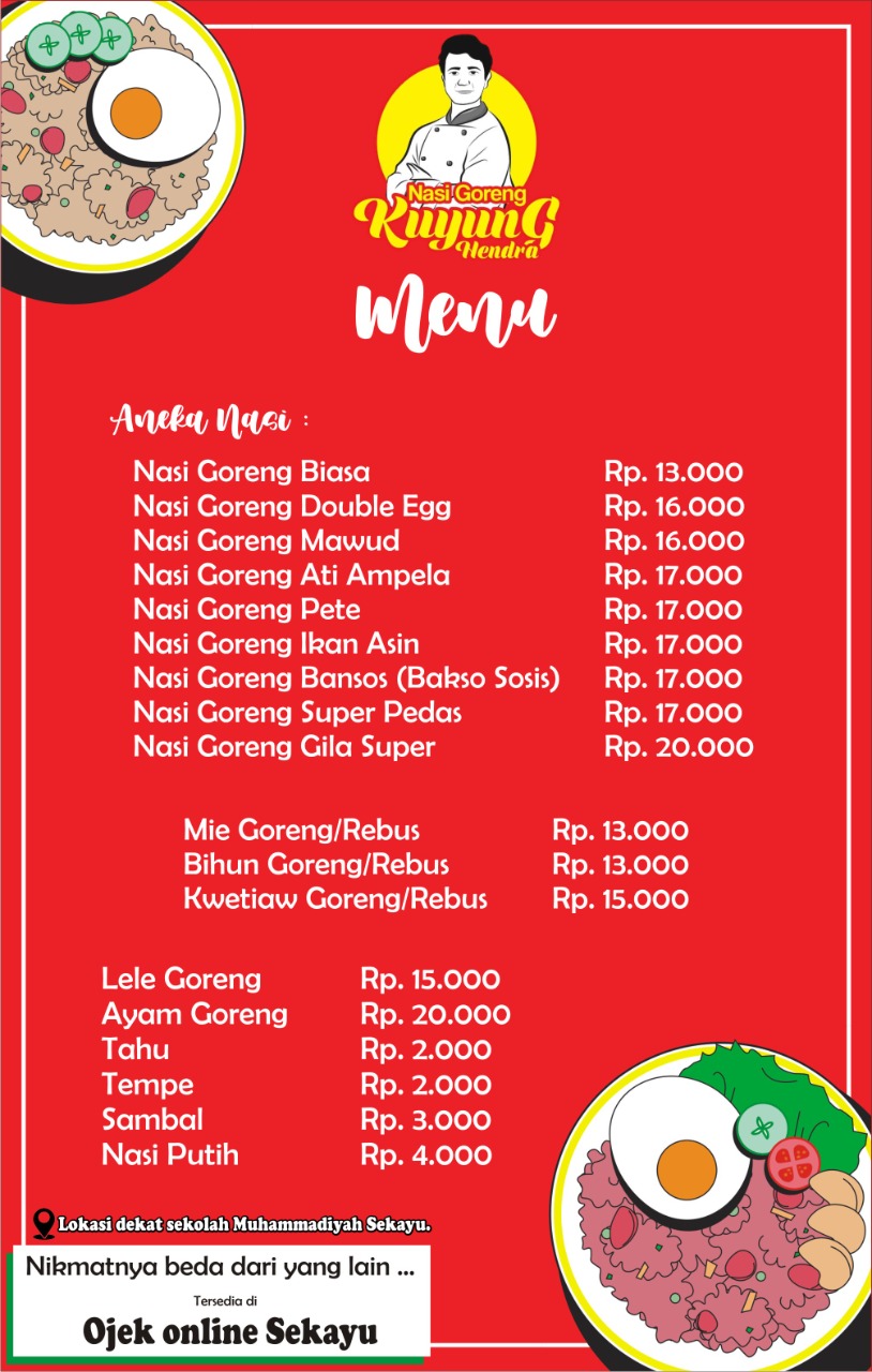 Pemesan nasi goreng Kuyung Hendra dapat di beli langsung ketempat atau melalui pesan online melalui ojek online sekayu dan bisa juga melalui nomor pemesanan 081213177175