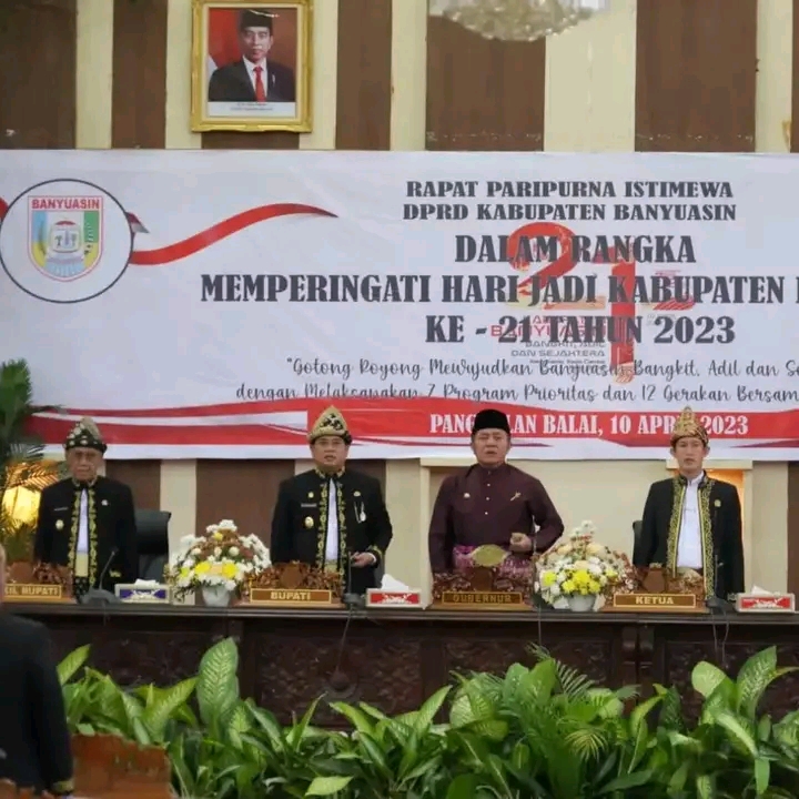 Untuk diketahui Sidang Paripurna Istimewa DPRD Kabupaten Banyuasin dalam rangka memperingati Hadi Jadi Kabupaten Banyuasin ke 21 Tahun dibuka langsung oleh Ketua DPRD Kabupaten Banyuasin, Irian Setiawan didampingi Wakil -wakil ketua dan anggota DPRD Banyuasin.
